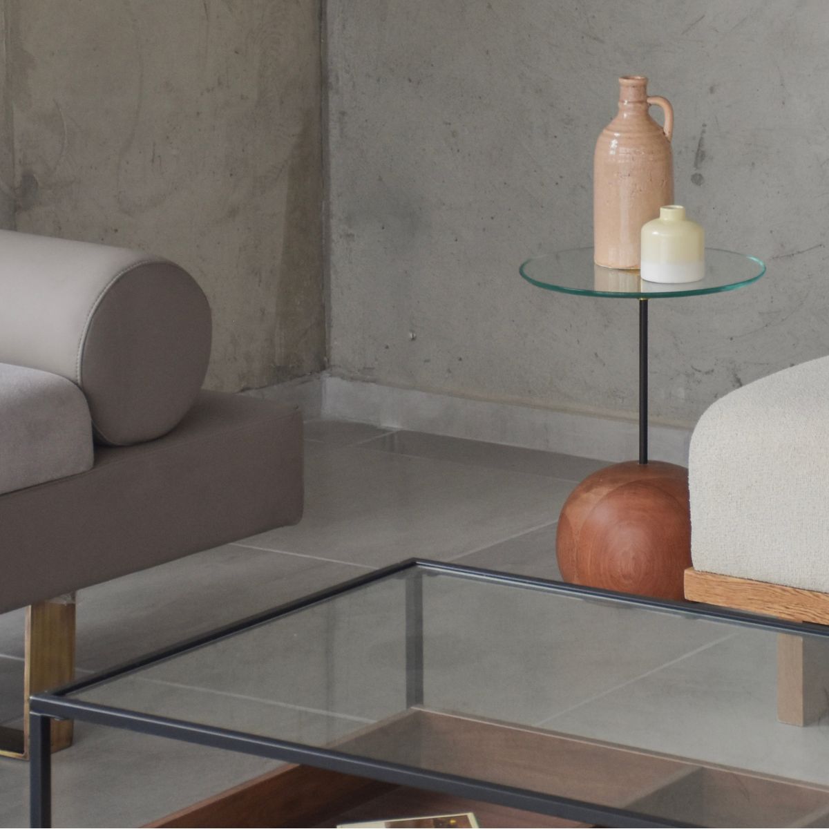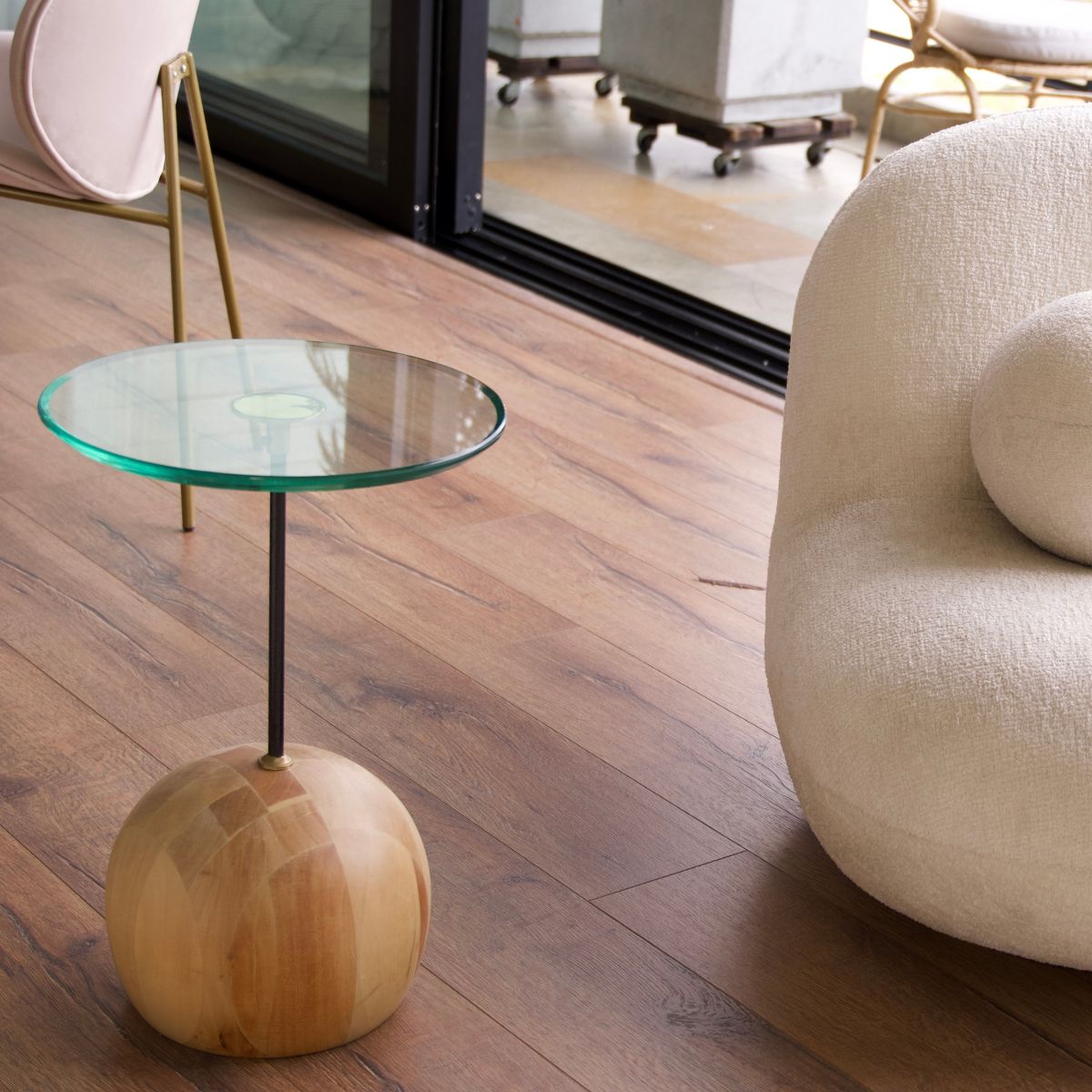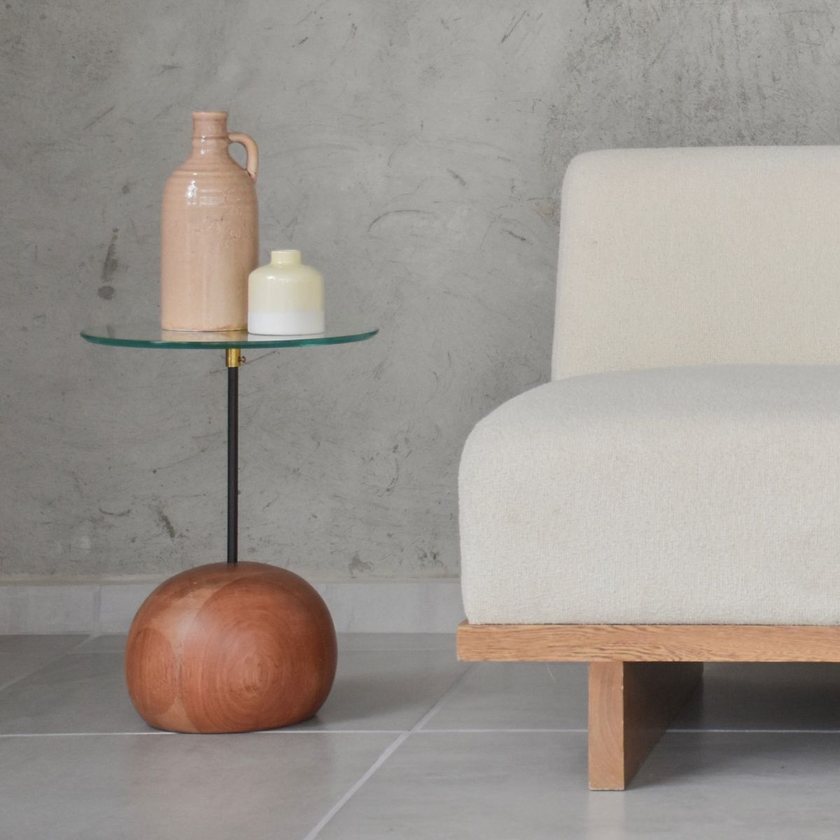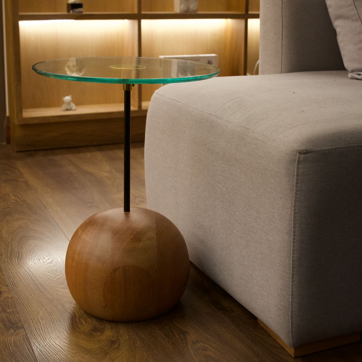 Fabricada en Madera roble torneada, soporte metálico y tapa superior en vidrio.